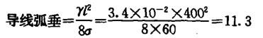 问题 某220kV线路的某耐张段,代表档距430m,γ1=3.4X1O-2 N/(m*mm2),已知导线最大弧垂发生在最高气温,其应力为60N/mm2。 平地,档距400m,两侧塔等高,通过非居民区,铁塔呼称髙(下横担对地高度)应不小于()M。