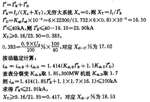 问题 某300MW机组6kV设A、B两段,分别接有电动机总功率17900、22300kW,其中I类电动机容量占80%。电动给水泵为5000kW,给水泵启动前厂用母线已带负荷S1为18000kVA,给水泵参数:启动电流倍数K Q=6,额定效率如=0.97,额定功率因数cosφ=0.9;高压厂用变压器参数:容量40/25—25MVA,电压20±2X2.5%/6.3—6.3kV。厂用电选择开断水平40kA、动稳定1OOkA的标准开关设备,并配置有效的快速切换装置,高压厂用变压器髙压侧按无穷大电源系统考虑,试确定高压厂用变压器的半穿越电抗X DL-2’ %的取值,开断水平按Os计算。 髙压厂用变压器的半穿越电抗X DL-2’ %最小可取为()。