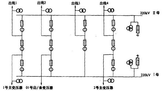 某火力发电厂电气主接线如图2所示。为节约线路走廊,出线1和出线2为同塔双回送出,出线3和出线4也为同塔双回送出。 配电装置采用屋外敞开式普通中型配...