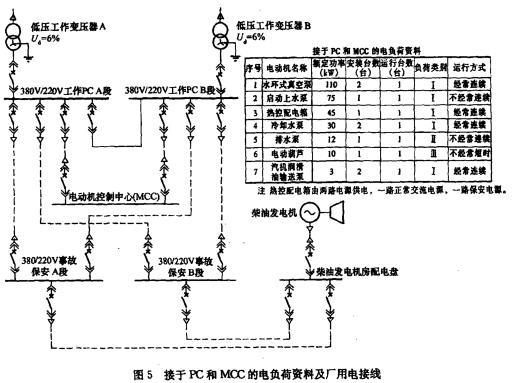 问题 某300MW机组火力发电工程,主厂房设两台工作变压器,容量互为备用,设一段电动机控制中心(MCC),变压器中性点直接接地?选择柴油发电机组时,事故保安A段计算负荷为435kVA,B段计算负荷为430kVA,重复计算负荷300kVA。接于PC和MCC的电负荷资料及厂用电接线见图5。 柴油发电机中性点接地方式应采用()。
