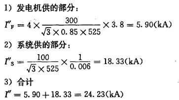 问题 某电厂新建4X300MW国产亚临界燃煤发电机组,以500kV升高电压接入系统,500kV出线2回,500kV出线及母线均不装设高压并联电抗器。4台机组连续建设,均采用发电机一变压器组单元接线接人厂内5OOkV每线,该电厂是区域性主力电源,在系统中具有十分重要的地位。取基准容量Sj=1OOMVA,500kV系统正、负序电抗为0.006,零序阻抗为0.013;主变压器370MVA,Ud=14%,零序阻抗105.1Ω;发电机额定功率3OOMW,最大连续功率33OMW,直轴超瞬变电抗(饱和值)X"d=16%,负序电抗(饱和值)X2=17.18%,零序电抗(饱和值)X0=7.3%,cosφ=0.85,出口电压为20kV。主保护动作时间加相应断路器开断时间为0.1s,后备保护动作时间加相应断路器开断时间为1s。 根据每台机的计算电抗X js査运算曲线,可知每台机的短路电流标么值为3.8,试计算5OOkV母线的三相短路电流周期分量的起始有效值为()。 A.24.82kA; B.24.23kA; C.24.53kA; D.23.97k