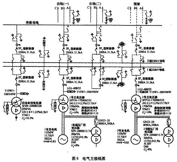 某电厂新建两台135MW燃煤发电机组,电厂以220kV电压接入系统,出线2回,预留1回。两台机组均采用发电机一变压器组单元接线接入厂内220kV母线。发电...