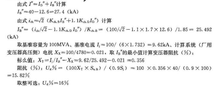解析 解答过程: 以厂用电系统短路水平控制在40kA(有效值)、1OOkA(峰值)为条件,确定变压器阻抗的最小值: