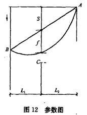 问题 某220kV线路,双分裂LGJ—300/40导线,悬垂绝缘子串长为3.Om,计算弧垂用,k值取7.75X10-5l/m,使用的铁塔如图10所示。 该线路交叉跨越某11OkV线路,无冰无风时导线应力σ=5.6kg/mm2,其余参数如图12。 A、B分别为220kV线两塔的标髙(A=860m,B=820m),C为跨越处110kV线的标髙(815m),L1=200m,L2=350m,不考虑裕度,交叉点两线路间的净空距离为()m。