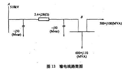 问题 有一额定电压为500kV的输电网,已知500kV输电线路使用4XLGJQ-300型分裂导线,长度为100km。其电气参数电阻R=2.4Ω、电抗X=28Ω、充电功率Q=1OOMvar如图13所示。 电源侧A母线送出的功率为()。