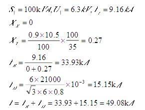 已知:厂用高压变压器高压侧系统阻抗为无穷大,接在B段的电动机负荷为21000kVA,电动机平均反馈电流倍数取6.ηcosμD取0.8,求B段的短路电流最接...