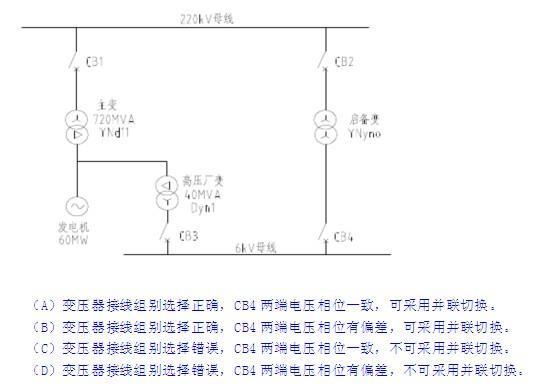 解析 分析GB/T17468-2008附录A的图A.1的1点和11点向量图Y,d11的Y侧比发电机侧超前30,,而D,y1的Y侧也比发电机侧超前30,即6kV与220侧相位一致,均发 电机侧超前30,可以并联切换,所以选A