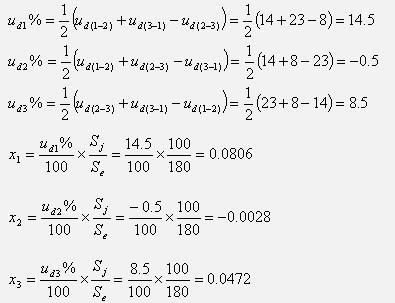 问题 220kV变电所,一期2*180MVA主变,远景3*180MVA主变。三相有载调压,三相容量分别为180/180/90,Ynynd11接线。调压230(8)*1.25%/117kV/37kV,百分电抗X1高中=14,X1高低=23,X1中低=8,要求一期建成后,任一主变停役,另一台主变可保证承担负荷的75%,220kV正序电抗标幺值0.0068(设SB=100MVA),110kV、35kV侧无电源。