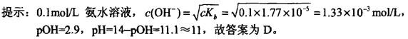 ,用广泛pH试纸测定0.lmol/L氨水溶液的pH值约是 ( )。A. 13B. 12C. 14D. 11