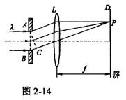 问题 一束波长为λ的平行单色光垂直入射到一单缝AB上,装置如图2-14所示。在屏幕上D形成衍射图样,如果P是中央亮纹一侧第一个暗纹所在的位置,则的长度为 ( ),