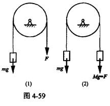 问题 如图4-59所示(1)、(2)系统中的均质圆盘质量、半径均相同,角速度与角加速度分别为ω1、ω2和α1、α2,则有( )。