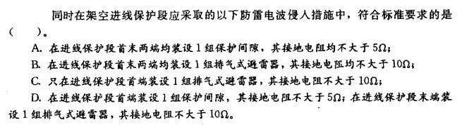 解析 依据同上及其图16,当变电所架设避雷线的进线保护段长度减少到500~600m时,应 在进线保护段首端装设一组排气式避雷器(FE1)或保护间隙(FG),其接地电阻不应超过 5n;其末端亦应装设一组排气式避雷器(FE2),其接地电阻不应超过lOn。