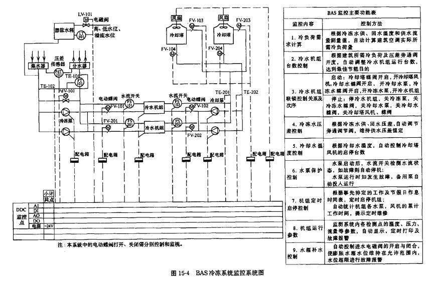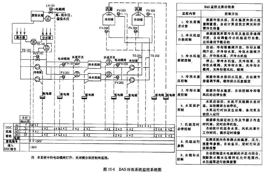 某建筑采用压缩式制冷系统,图15-4为其监控系统图。 按照图15-4中设定的控制要求,在图下部的表格中,将各监控点所属的类型、监控点数量详细标出,...