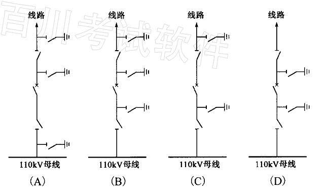 问题 某100kV户外变电所,设有两台主变压器,2回电源进线(电源来自某220kV枢纽变电站的110kV出线),6回负荷出线。负荷出线主保护为速断保护,整定时间为T1;后备保护为过流保护,整定时间为T2;断路器全分闸时间为T3。 请回答下列问题。 请分析说明下列出线间隔接线图中,断路器、隔离开关及接地开关的配置,哪种是正确的? ( )