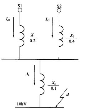 一个供电系统由两个无限大电源系统S1、S2供电,其短路电流设计时的等值电抗如右图所示,计算d点短路时,电源S1支路的分布系数应为下列哪一项数值?(...
