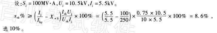 问题 某变电站10kV母线短路容量250MV·A,如要将某一电缆出线短路容量限制在100MV·A以下,所选择限流电抗器的额定电流为750A,该电抗器的额定电抗百分数应不小于下列哪一项数值? () (A)5 (B)6 (C)8 (D)10