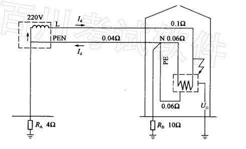 某建筑物釆用TN-C-S系统供电,建筑物地下室设有与大地绝缘的防水层。PEN线进户后即分为PE线和N线,并打人工接地极将PE线重复接地。变电所系统接地RA...