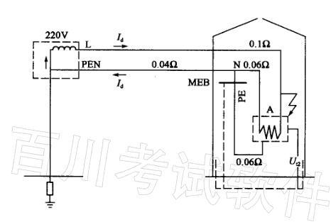 解析 《工业与民用配电设计手册》(第三版)P920、921作总等电位联结内容。短路分析:发生故障后,相保回路电流由相线L(0.1Ω)流经建筑物内PE线(0.06Ω),再流经PEN线(0.04Ω)返回至变压器中性点,全回路电阻況和电路电流Id为: R = 0. 1 + 0. 06 + 0. 04 = 0.20 Id =220/0.2 = 1100A 接触电压为碰壳点与MEB之间的电位差:Ut2= IdRPE= 1100 X0.06 = 66V