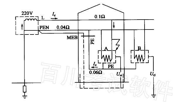 解析 《工业与民用配电设计手册》(第三版)P920、921作总等电位联结内容。短路分析:发生故障后,相保回路电流由相线L(0.1Ω)流经建筑物内PE线1段(0.06Ω),再流经PE线2段(0.04Ω)返回至变压器中性点,全回路电阻R和电路电流Id为: R= 0. 1 + 0. 06 + 0. 04 = 0. 2Ω Id=220/0.2 = 1100A A设备的接触电压Ut2为碰壳点与MEB之间的电位差,Ut4=IdRPE=1100 x 0.06 = 66V B设备的接触电压Ut3为碰壳点与大地之间的地位差,由于变压器中性点直接接地,大地与变压器中性点等电位,因此B设备外壳接触电压为: Ut5=Id(RPE1+RPE2) =1100 x (0.06 +0.04) =110V