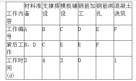 问题 背景: 某人防工程,建筑面积5000m2,地下1层,层高4.0m,基础埋深为自然地面以下6.5m。建设单位委托监理单位对工程实施全过程监理,建设单位和某施工单位根据《建设工程施工合同(示范文本)》GF-2013-0201签订了施工承包合同。工程施工过程中发生了下列事件: 事件一:施工单位进场后,根据建设单位提供的原场区内方格控制网坐标进行该建筑物的定位测设。 事件二:工程楼板组织分段施工,某一段各工序的逻辑关系见下表: 事件三:砌体工程施工时,监理工程师对工程变更部分新增构造柱的钢筋做法提出疑问。 事件四:工程在设计时就充分考虑“平战结合、综合使用”的原则,平时用作停车库,人员通过电梯或楼梯通道上到地面。工程竣工验收时,相关部门对主体结构、建筑电气、通风空调、装饰装修等分部工程进行了验收。 问题: 1.事件一中,建筑物细部点定位测设有哪几种方法 本工程最适宜采用的方法是哪一种 2.根据事件二表中给出的逻辑关系,绘制双代号网络计划图,并计算该网络计划图的工期。 3.事件三中,顺序列出新增构造柱钢筋安装的过程。 4.根据人防工程的特点和事件四中的描述,本工程验收时还应包含哪些分部工程