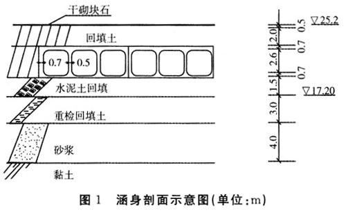 背景某立交地涵工程主要由进口控制段、涵身、出口段等部分组成,涵身共有23节,每节长15m,涵身剖面如图1所示。涵身地基采用换填水泥土处理,水泥...