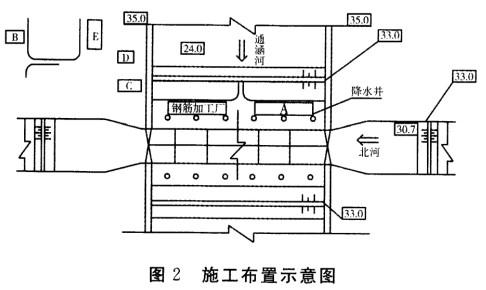 问题 背景 某立交地涵工程主要由进口控制段、涵身、出口段等部分组成,涵身共有23节,每节长15m,涵身剖面如图1所示。 涵身地基采用换填水泥土处理,水泥土的水泥掺量为6%,地基承压含水层承压水位为23.0m,基坑采用深井降水。施工采用一次性拦断河床围堰导流。在河道上下游各填筑一道均质土围堰,并安排在一个非汛期(2010年9月~2011年5月)内完成地涵施工。施工布置示意图如图2所示。 施工中发生如下事件:事件1:根据本工程具体特点,施工单位进场后,对工程施工项目进行了合理安排。工程主要施工项目包括:①涵身施工,②干砌石河底护底,③排水清淤,④土方回填,⑤降水井点,⑥围堰填筑,⑦基坑开挖。事件2:根据工程施工需要,施工单位在施工现场布置了生活区、钢筋加工厂、混凝土拌合站、油库、木工加工厂、零配件仓库等生产生活设施,如图2所示。事件3:本工程项目划分为一个单位工程,11个分部工程。第3段涵身分部工程共有56个单元工程,其中26个为重要隐蔽单元工程;56个单元工程质量全部合格,其中43个单元工程质量优良(21个为重要隐蔽单元工程);该分部工程的其它质量评定内容均符合优良标准的规定。事件4:本工程闸门、启闭机制造与安装为一个合同标,2011年9月16日通过了该合同工程完工验收,并颁发合同工程完工证书;本工程2012年12月8日通过了竣工验收,项目法人于2012年12月20日向该合同承包商退还了履约担保和质量保证金。 问题: 1.指出事件1中主要施工项目的合理施工顺序(用工作编号表示)。 2.指出事件1中涉及施工安全的最主要的两项工程施工项目。 3.根据事件2,指出图2中A、B、C、D、E对应的生产生活设施名称。 4.根据事件3,评定第3段涵身分部工程的质量等级,并说明理由。 5.根据《水利水电工程标准施工招标文件》(2009年版),改正事件4中项目人退还履约担保和质量保证金的不妥之处。