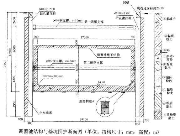 问题 背景资料: 某公司承建城市桥区泵站调蓄工程,其中调蓄池为地下式现浇钢筋混凝土结构,混凝土强度等级C35,池内平面尺寸为62.0m*17.3m,筏板基础,场地地下水类型为潜水,深埋6.6m。设计基坑长63.8m、宽19.1m、深12.6m,围护结构采用φ800mm钻孔灌注桩排桩+2道φ609mm钢支撑,桩间挂网喷射C20混凝土,桩顶设置钢筋混凝土冠梁。基坑围护桩外侧采用厚度700mm止水帷幕,如下图所示。 施工过程中,基坑土方开挖至深度8m处,侧壁出现渗漏,并夹带泥沙;迫于工期压力,项目部继续开挖施工;同时安排专人巡视现场,加大地表沉降、桩身水平变形等项目的检测频率。 按照规定,项目部编制了模板支架及混凝土浇筑专项施工方案,拟在基坑单侧设置泵车浇筑调蓄池结构混凝土。 问题: 1.列式计算池顶模板承受的结构自重分布载荷q(kN/m2),(混凝土重度y=25kN/m3);根据计算结果,判断模板支架安全专项施工方案是否需要组织专家论证,说明理由。 2.计算止水帷幕在地下水中的高度。 3.指出基坑侧壁渗漏后,项目部继续开挖施工存在的危险。 4.指出基坑施工过程中风险最大的时段,并简述稳定坑底应采取的措施。 5.写出上图中细部构造