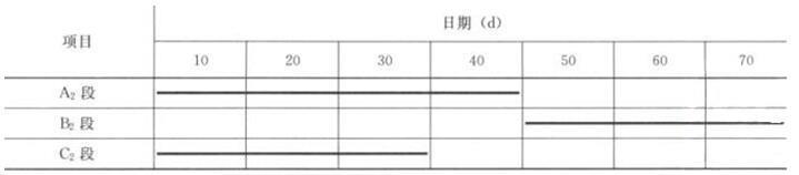 解析 1.C2段改为顶管施工必须获得设计变更通知单(文件、图纸),设计变更通知单应由原设计人和设计单位负责人签字并加盖设计单位印章。2.重新编制的施工方案应有变更审批手续。3. 注意:A2段尾与B2段头搭接不搭接无所谓,但B2段头不得越过A2段尾。4.在地面井口周围应设置安全护栏、防汛墙、防雨设施和警示设施。 1.本问的考点是设计变更的程序。设计变更通知单、洽商记录是施工图的补充和修改,应在施工前办理。内容应明确具体,必要时附图。设计变更通知单,必须由原设计人和设计单位负责人签字并加盖设计单位印章方为有效。 [解答分析]根据设计变更的程序做简明扼要的回答。2.本问的考点是变更施工组织设计后的审批程序。重新编制的施工方案、施工组织设计,应按原审批程序办理变更方案的审批手续。 [解答分析]依据施工组织设计审批程序要求作简答。3.本问意在考查考生的施工部署能力和画横道图能力。画图时要注意的是A2段的长度是400m,B2段的长度是300m,所以各自的施工工期都应该比A1、B1短。在考虑少投入施工设备及施工人员的基础上,最省钱的办法是在原计划投入的人员设备的基础上,增加一支顶管作业队伍和一套顶管设备。换句话就是说,在保持总工期70d不变的前提下,展开两条作业线,一条是开槽埋管作业线,一条是顶管作业线。开槽埋管作业线是A2段首先开工,施工完A2段后,接下去再施工B2段;这样反映在横道图上A2段尾与B2段头搭接不搭接无所谓,但B2段头不得越过A2段尾;而顶管作业线C2段的起点与终点则由现场条件决定,但要在总工期70d的范围内。 [解答分析]依据横道图画法和背景资料中给出的已知条件:总工期为70d,其中,A1段(425m)工期40d,B1段(325m)工期30d,A1段首先具备开工条件。项目部建议业主将现有道路段(即C2段)50m改为顶管施工,需工期30d,取得了业主同意。在考虑少投入施工设备及施工人员的基础上,重新编制了施工方案及施工进度计划。4.本问的考点是顶管工作井的地面防护措施。 [解答分析]顶管工作井视作深基坑,可按深基坑地面防护措施作简答。