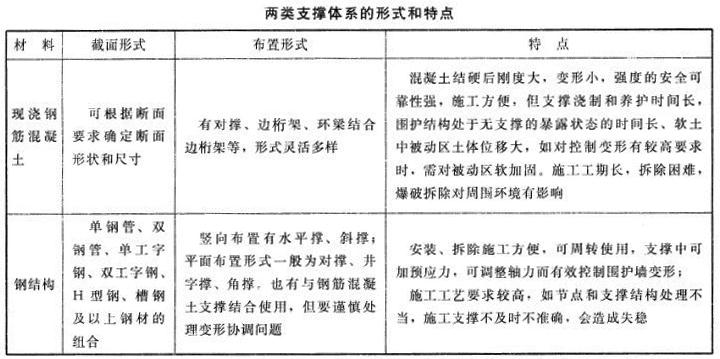 解析 在深基坑的施工支护结构中,常用的支撑系统按其材料可分为现浇钢筋混凝土支撑体系和钢支撑体系,见下表。两类支撑体系的形式和特点