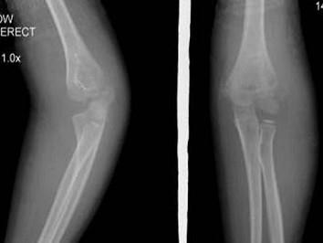 问题 6岁女性患者,因外伤后致左肘关节肿痛,活动受限,外踝局部压痛明显X线摄片如图,最合适的诊断是 ( )