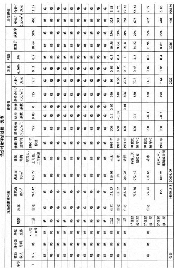 估价师接受事务所指派后,曾在气候条件较恶劣的冬季先后两次进×县对估价对象进行初勘、详勘和复勘,向当地居委会、公安局、房管局和建设局等政府相关部门的工作人员和居民进行了咨询,了解当地住宅的建造风格特色、建筑用料、建筑结构、装饰装修、成新状况、局部更新改造等因素形成的造价差异,以及成新状况的鉴别等,制定了×县乙镇各类房屋的一般造价水平,即建安费基准单价(其中分主体结构费单价,水电安装费单价,初装修费单价)、结构修正系数和装修修正系数,然后根据各估价对象的实际情况测算得出各估价对象建筑工程费,详见估价对象评估过程一览表。