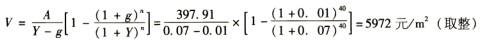 年净收益=有效毛收入-营业税及附加-房产税-维修费-管理费-保险费= 520. 13 - 28. 61 - 62. 42 -5.2- 15.6- 10. 39=397. 97(元/m2)