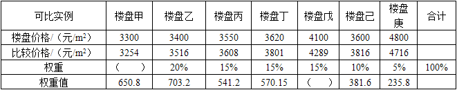 选项 A.楼盘甲的权重为20% B.楼盘戊的权重值为643.35 C.项目较为合理的均价应定为3726元/m2 D.对每个重点市场比较楼盘进行价格调整时,可由公司销售经理决定