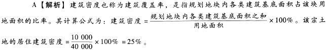 问题 甲房地产开发公司在土地一级市场上取得一宗开发用地,该宗土地面积为40 000平方米, 其中城市代征绿地面积为15 000平方米,其余为居住建筑用地,居住建筑基底面积为10 000平方米,规划批准的总建筑面积为70 000平方米。 该宗土地的居住建筑密度为( )。