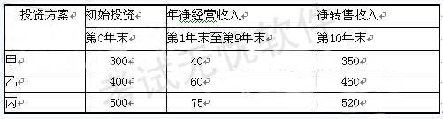 张某完全靠500万元的自有资金进行房地产置业投资。经市场调研,有甲、乙、丙三个投资方案可供选择。各方案的初始投资、年净经营收入和净转售收入见下表,计算期均...
