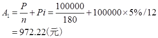 解析 已知:贷款金额P=100000元,贷款月利率i=5%/12,按月计算的贷款期限n=15×12=180(个月)。该家庭第1个月的月还款额计算如下: 王某最后1个月的月还款额计算如下: