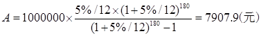 解析 等额本息还款的计算公式为: 式中,A为月还款额;P为贷款金额;i为贷款月利率;n为按月计算的贷款期限。题中,贷款月利息i=5%/12,按月计算的贷款期限n=15×12=180(个月),代入公式得,张某每月应还款金额为: