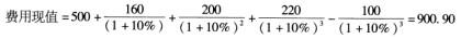 问题 某项目的投资额为500万元,运营期为3年,各年的运营费用分别为160万元、200万元和220万元,残值为100万元。若投资发生在年初,费用发生在年末,折现率为10%,则该项目的费用现值为()万元。