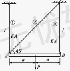 解析 杆①、②、③均为二力杆,方向沿杆轴线,对A点进行受力分析,得N2=0;由AB杆的受力对称可知N1=P/2、N3=P/2,,再用胡克定律可求出Δl1=Pl/2EA、Δl2=0、Δl3=Pl/2EA。由于A点受力变形后依然要连接杆①和杆②,而杆②不变形,故可用切线代替圆弧的办法求出A的水平位移δAx=δAytan45°=Pl/2EA。