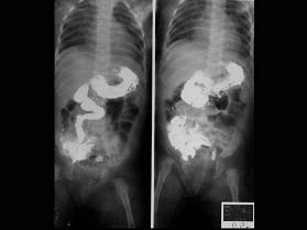 问题 女婴,出现持续性呕吐,腹胀,如图所示,最可能的诊断为?(?)