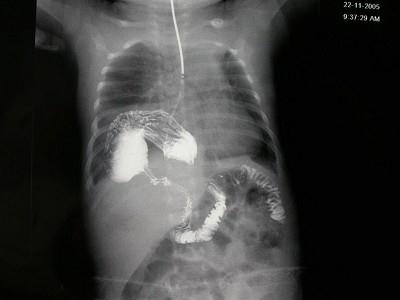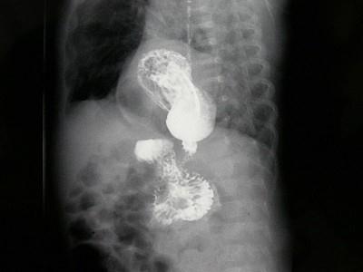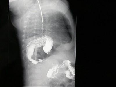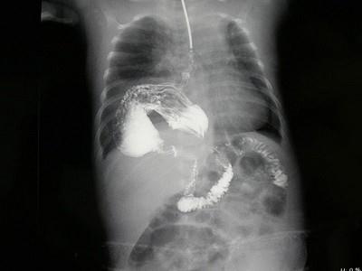 女,1岁,反复呕吐伴中度营养不良,结合影像,最可能的诊断为?(?)A.肺脓疡B.膈疝C.食道裂孔疝D.包裹性液气胸E.胃扭转