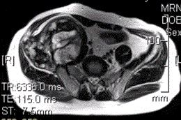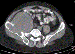 患者男,28岁,右下腹及臀部疼痛5个月余。查体:右髂骨外后侧压痛,右下腹可触及一软组织包块,质韧,固定。行骨盆正位CR、骨盆CT及MR扫描见下图。...