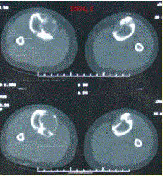 问题 患者女,20岁,右小腿疼痛1周。行双小腿正侧位CR,并行双小腿CT及MR扫描,见下图。 对于此病变的征象,描述不正确的是
