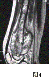 问题 患者男,16岁,左大腿下部疼痛伴肿胀2个月,逐渐加重。自感左膝上方胀痛,尤以夜间为著,伴行走困难。既往史及家族史无特殊。查体:左大腿下部明显肿胀,皮温较对侧升高。碱性磷酸酶明显增高。股骨平片及MRI见下图。 你认为对定性诊断有价值的征象是