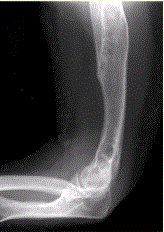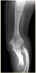 患者男,22岁,长期存在骨和关节变形,近期出现右肘关节疼痛,进行性加重。行右肘关节X线正侧位片检查,见下图。有关内生软骨瘤(Ollier病),...