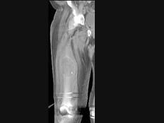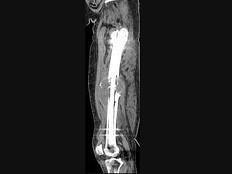 男,18岁,右股骨肿瘤术后,出现大腿中段疼痛,夜间尤甚,结合CT图像,最可能的诊断是?(?)A.骨纤维肉瘤B.尤文肉瘤C.骨肉瘤 ...