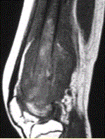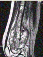 患者男,16岁,左大腿下部疼痛伴肿胀2个月,逐渐加重。自感左膝上方胀痛,尤以夜间为著,伴行走困难。既往史及家族史无特殊。查体:左大腿下部明显肿胀,皮温较对...