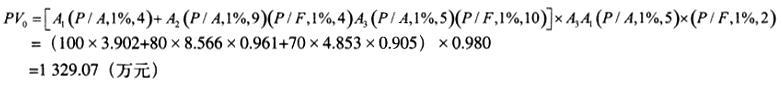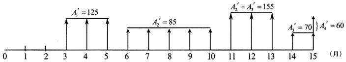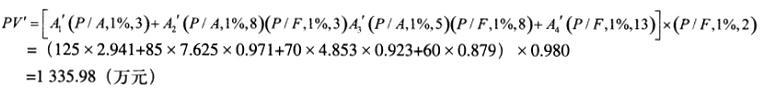 解析 1.基础工程每月工程款: 上部结构工程每月工程款: 安装工程每月工程款: 提前工期奘: 其中,第9至第1 1个月每月的工程款为: 则加速施工方案的现金流量如下图所示(单位:万元)。 2.若不考虑资金的时间价值,由于加速施工的技术措施费为25+40=65(万元),超过提前2个月的工期奖2*30=60(万元),因此,不压采用加速施工方案。 3.若考虑资金的时间价值,需分别计算原方案和加速施工方案工程款的现值。 (1)计算原方案工程款的现值: 基础工程每月工程款:A1 =400/4=100(万元) 上部结构工程每月工程款A2 =720/9=80(万元) 安装工程每月工程款:A3=350/5=70(万元) 则,原方案工程款的现值为: (2)计算加速施工方案工程款的现值: (3)计算两者的差额:PV′-PV0=1 335.98-1 329.07=6.91(万元),由于加速施工方案所得工程款的现值比原方案增加6.91万元,因此,应采用加速施工方案。