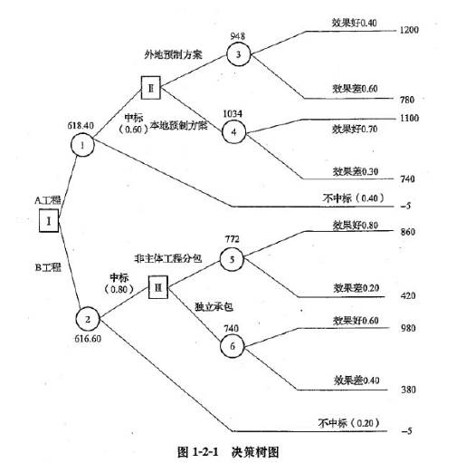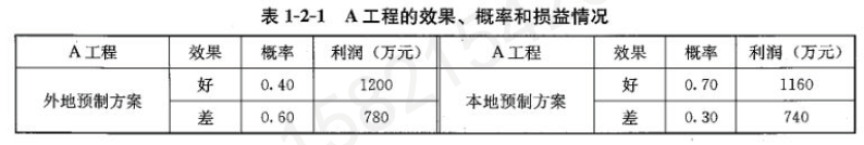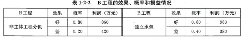 问题 某工程公司于2001 年8 月面临A、B 两项工程的投标,通过详细研究招标文件,并对A、B 两项工程所在地进行现场踏勘,该公司决定参加其中一项工程的投标。A、B 两项工程的决策数据如下: 1.A 工程估算直接成本8600 万元,需要预制大型钢筋混凝土构件36 个(单重2800t/件)。该工程的地质条件较为复杂,招标文件规定:A 工程投标报价=直接成本+利润+税金+(直接成本+利润+税金)X 总包干系数10%,在构件预制择选择上,公司面临如下选择: (1)使用公司现有的预制场,但该预制场离施工现场较远,构件需要从海上运输,大约增加成本240 万元。 (2)在工地新建一个构件预制场,耗资280 万元(考虑竞争对手在工地附近建有类似预制场,故该项费用只能列人施工成本之中) A 工程的效果、概率和损益情况见表1-2-1。 2.B 工程估算直接成本7800 万元,招标文件规定:工程投标报价=直接成本+管理费+利润+税金。B 地有一该专业领域的施工单位,以前曾经与本公司有过良好的合作,但因施工资质不达标,未能参加本次投标。如果将部分非主体工程(如中小型构件预制、土石方工程等)分包给该公司,将节约大量的机械调遣、模板加工费用,但公司获得的利润有可能降低。经过造价工程师详细测算,B 工程的效果、概率和损益情况见表1-2-2。 3.根据以往类似工程的投标资料,