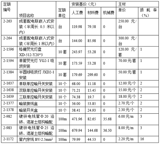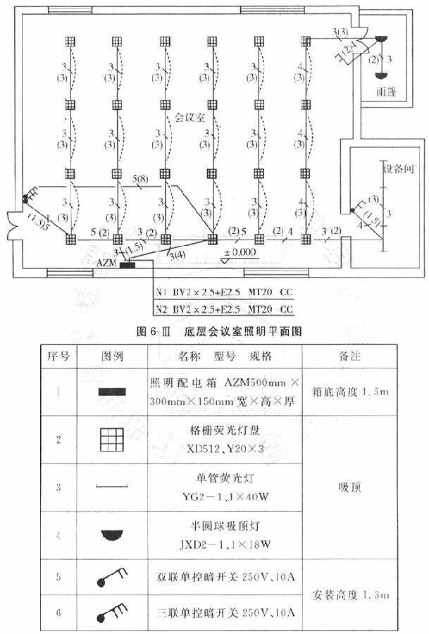 解析 正确答案是 1.(1)镀锌电线管Φ20暗配工程量计算式: 三线:3×3×5+2+[3+(5-4)]+2+3+2+[1.5+(5-1.5-0.3)]+[4+(5-1.5-0.3)]=69.9(m)。 (2)镀锌电线管Ф25暗配工程量计算式: 四线:3×3+2+[1.5+(5—l.3)]+[2+(4-1.3)]=20.9(m)。 五线:2+2+[8+(5-1.3)]+[1.5+(5-1.3)]=20.9(m)。 合计:20.9+20.9=41.8(m)。 (3)管内穿线BV-5002.5mm2工程量计算式:3×69.9+4×20.9+5×20.9+(0.5+0.3)×3×2=402.6(m)。 (4)表6-III-1分部分项工程和单价措施项目清单与计价表 工程名称:会议室照明工程标段:底层会议室照明平面图 2.表6-II-2综合单价分析表 工程名称:会议室照明工程标段:底层会议室照明平面图 解析 1.本案例第1问主要考查电气工程工程量计算方法。 (1)计算配管长度时,不扣除管路中间的接线箱(盒)、开关盒、灯头盒所占长度。但应扣除配电箱所占长度。 (2)计算配线长度时,按设计图示尺寸以单线长度计算。计算综合单价时,应考虑主材损耗。 2.本案例第2问主要考查计算电气配管综合单价时,Φ20镀锌电线管主材数量应考虑损耗。
